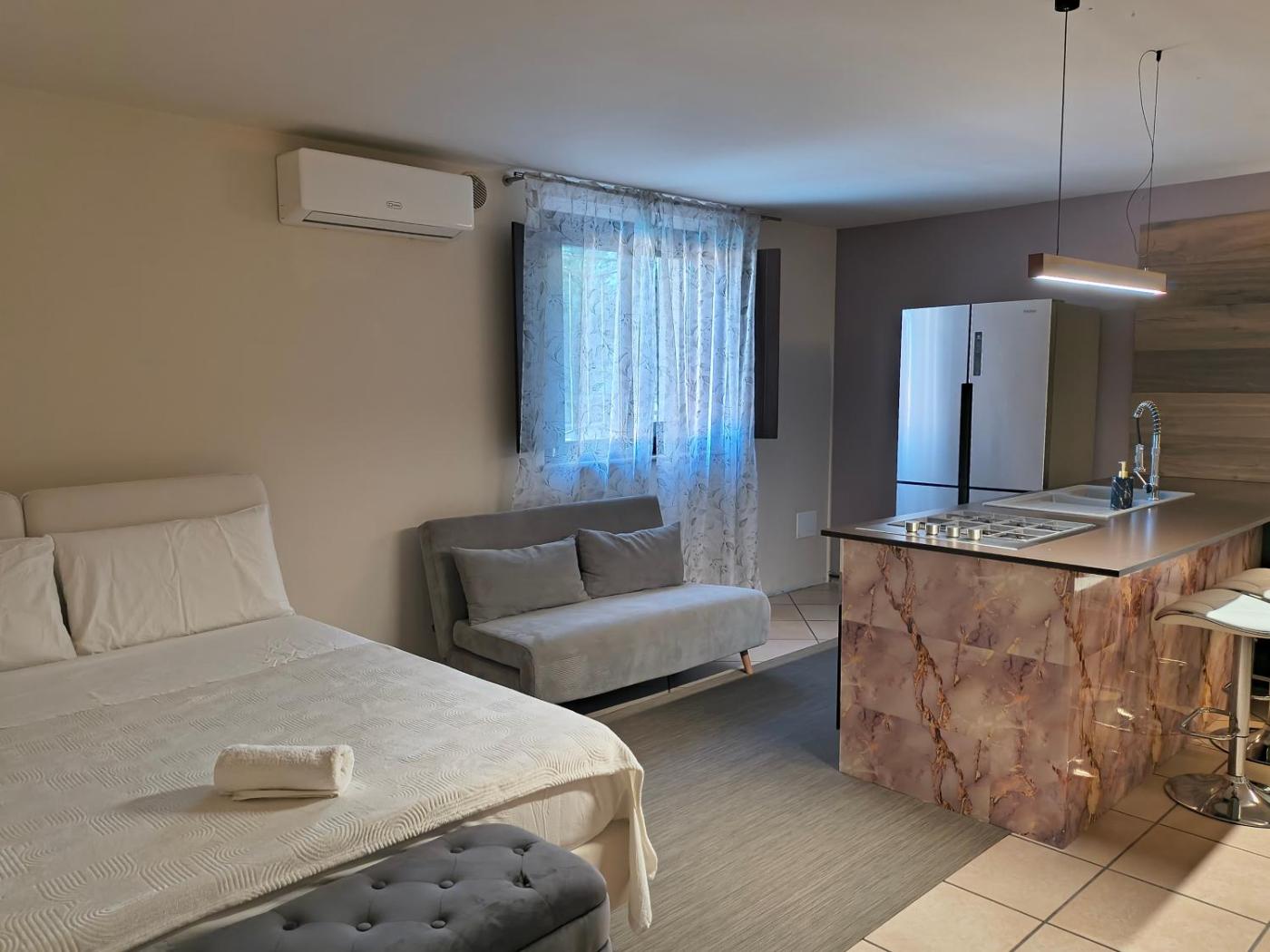 Studio Apartment with King Bed. Guests will have a special experience as the apartment offers a pool with a view. Featuring a private entrance, this spacious apartment also consists of 2 bedrooms, a seating area and 1 bathroom with a shower and a bidet. Guests will find a stovetop, a refrigerator, kitchenware and an oven in the kitchen. The apartment also offers a barbecue. The air-conditioned apartment provides a flat-screen TV, a washing machine, soundproof walls, a dining area as well as sea views. The unit offers 3 beds.