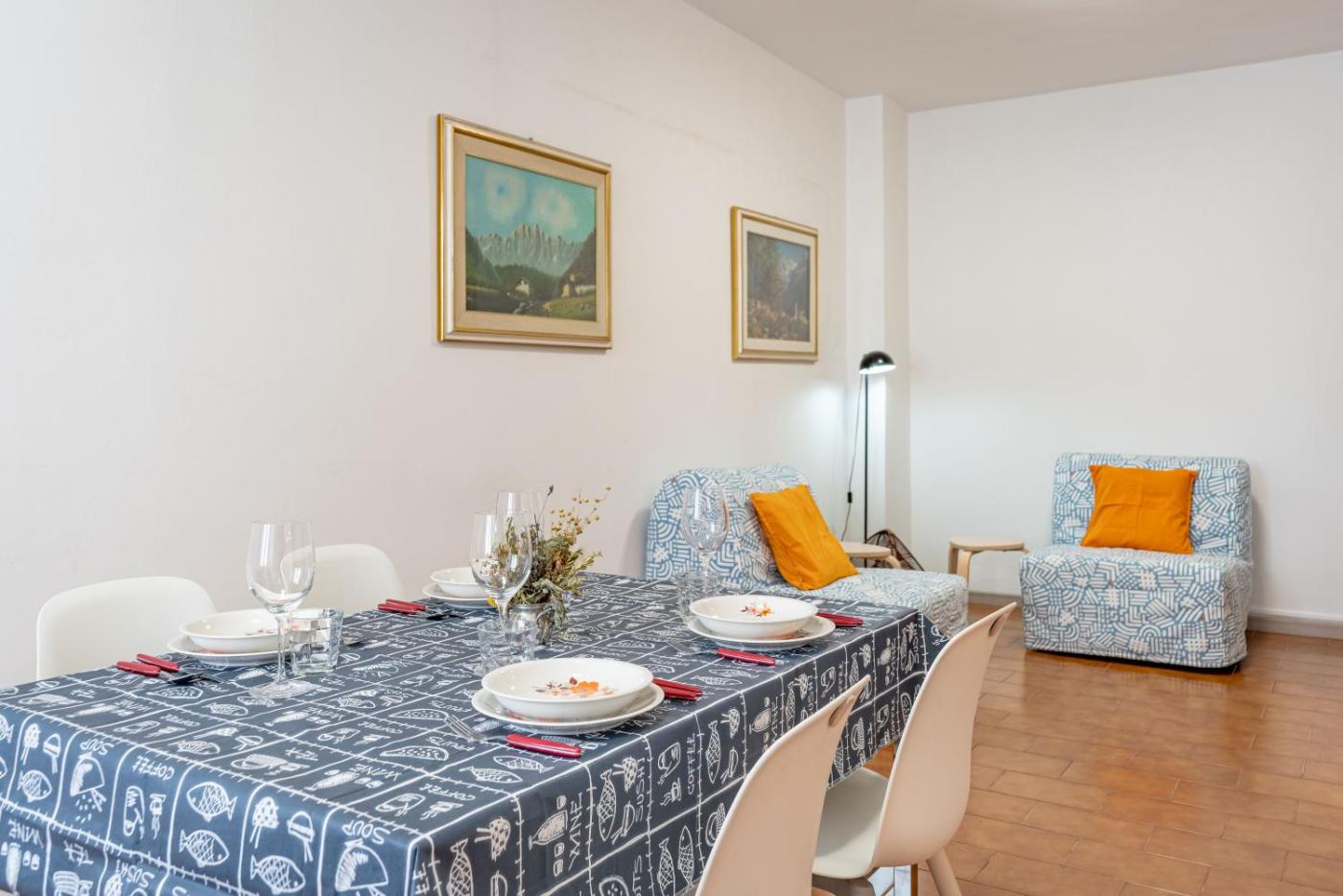 Two-Bedroom Apartment. This apartment is comprised of a kitchen, a seating area, 2 separate bedrooms and 1 bathroom with a shower and a bidet. Guests can make meals in the kitchen that is fitted with a stovetop, a refrigerator, a dishwasher and kitchenware. The apartment offers a tea and coffee maker, a dining area, a wardrobe, a TV, as well as a quiet street view. The unit offers 3 beds.